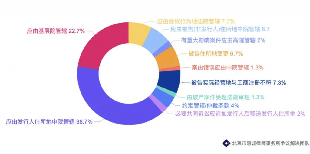 如图2.1-1所示,在534组类案中,被告提出管辖异议的有150组,其中被告认为应由发行人住所地中院管辖的有58组,占管辖异议类案组别的38.7%;认为应由基层院管辖的有34组,占22.7%;认为应由侵权行为地管辖的有11组,占7.3%;提出实际经营地与工商注册地不符,认为应由实际经营地有管辖权的法院管辖的有11组,占7.3%。